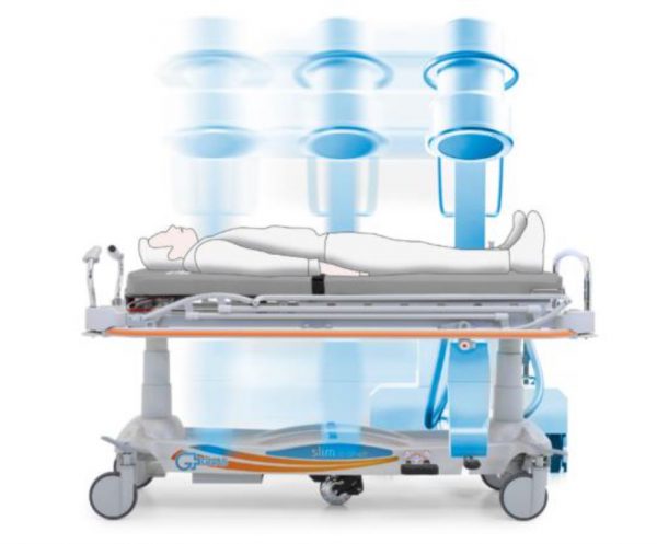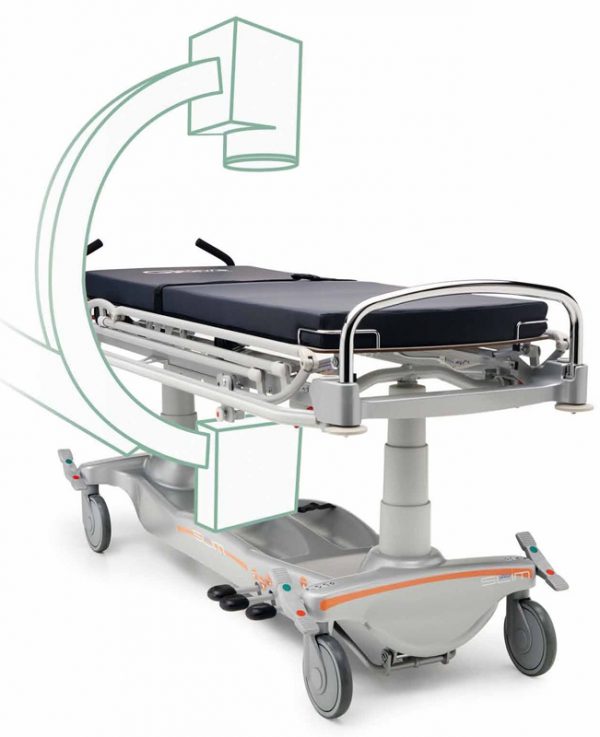“BT1220 Slim e-drive” stretcher with 2 sections, adjustable height and Trendelenburg, reverse-Trendelenburg on columns. Endowed with 5th